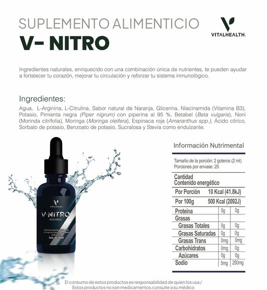 V-Nitro Ayuda a mejorar la salud cardiovascular. Proporciona mayor energía y rendimiento físico.